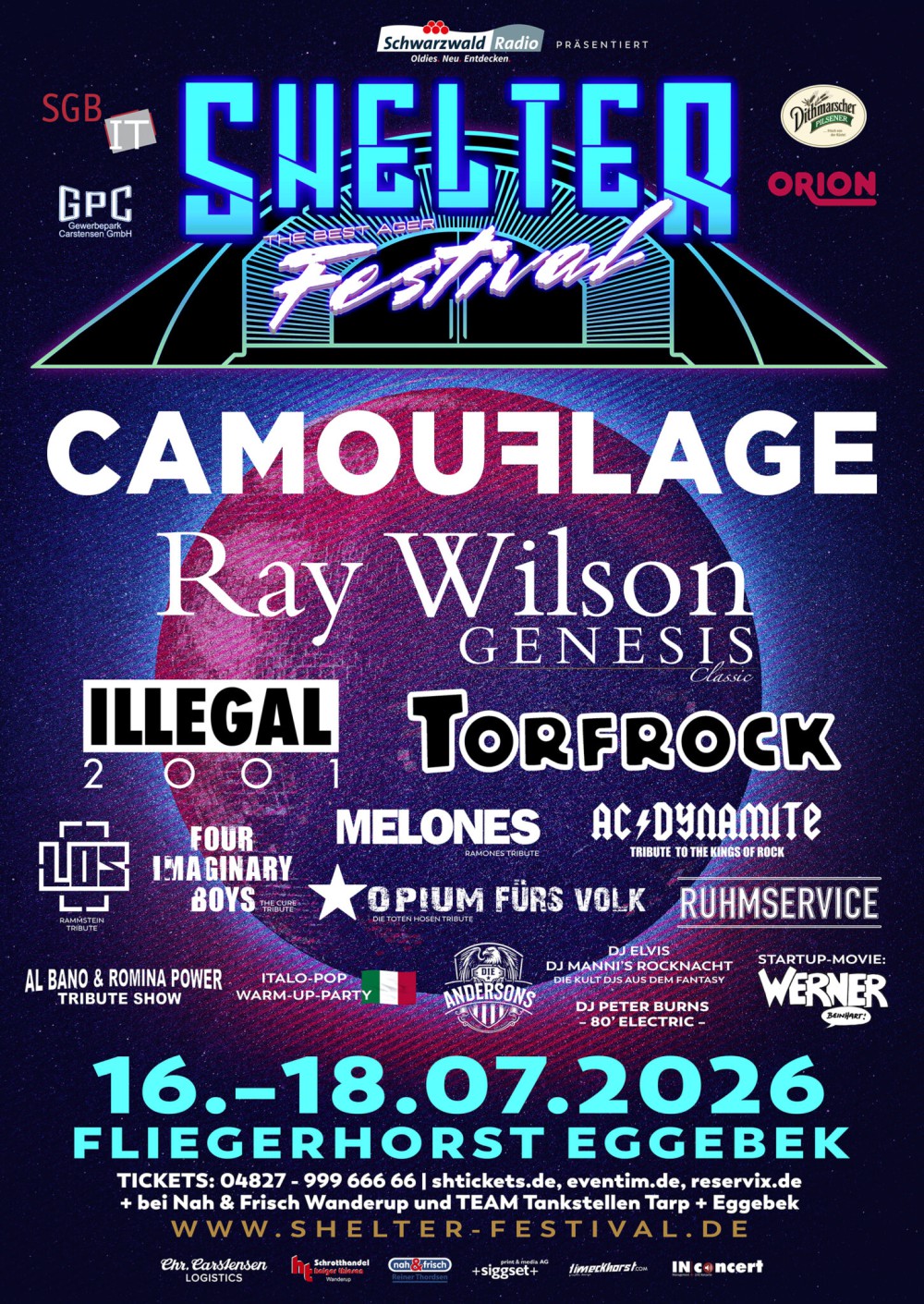 (02.11.2025) Vom 16. bis 18. Juli 2026 findet auf dem ehemaligen Militärflugplatz in Eggebek (Schleswig-Holstein) das SHELTER Festival statt. Camouflage spielen als Headliner am 17. Juli 2026 um 20 Uhr eine 100 minütige Show.