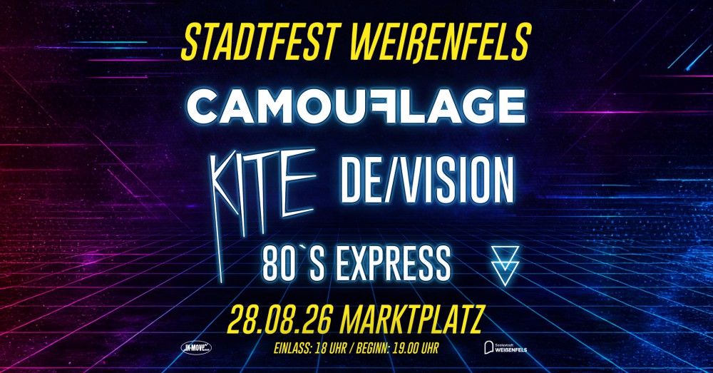 (25.03.2026) Am 28. August spielen Camouflage neben Kite, De/Vision und 80s Express bei der "Synthie Pop Night" auf dem Marktplatz in Weißenfels (Sachsen-Anhalt).
